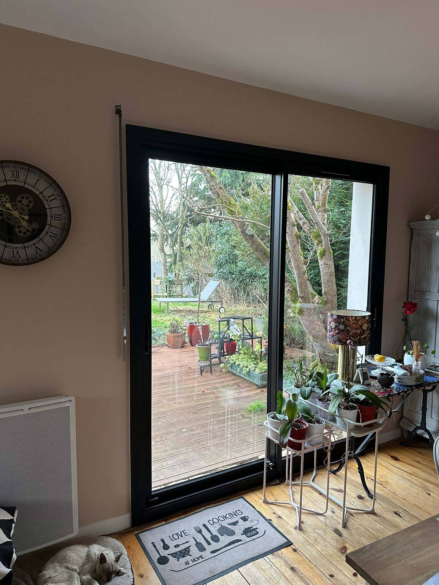 En complément des fenêtres, nous avons installé des coulissants de la marque K.Line, finition Noir 9005. Ces baies vitrées offrent un design minimaliste grâce à leurs montants fins, permettant un apport maximal de lumière naturelle dans les pièces de vie.